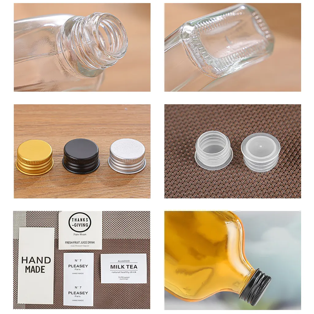 This series of glass bottles with lids has a look with a flat and rectangular shape, rounded shoulders and a narrow neck. These glass bottles are made of quality clear glass so you can see what is inside. Each bottle has a lid that screws on and off which is made of aluminum and has a plastic seal inside. This lid makes sure the bottle is closed tightly and is easy to handle. You can get these beverage bottles in sizes from 50ml to 500ml. They are great for packaging coffee, juice, milk tea and other liquids. The bottles are compact and strong which makes them perfect for displaying in stores taking away and selling in bulk.