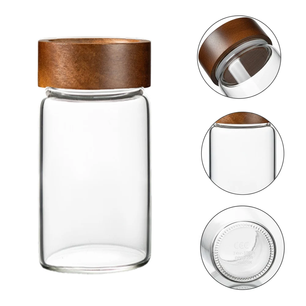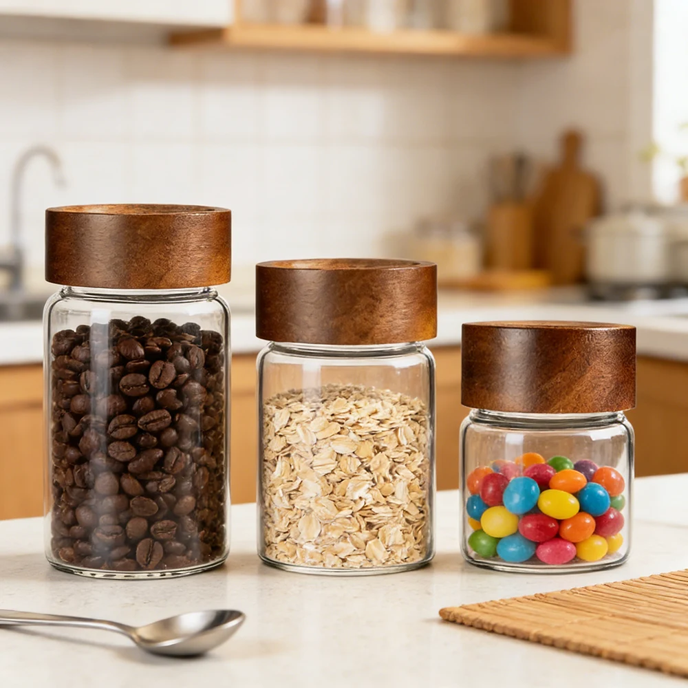 Stylish yet reliable, these small glass jars are made of borosilicate glass. The lids present an attractive, dark wood grain finish and they are available in different sizes ranging from very small to a bit bigger. A wholly clear glass body of the jar will help you easily see the small things inside (for example, spices, pins, or snacks).