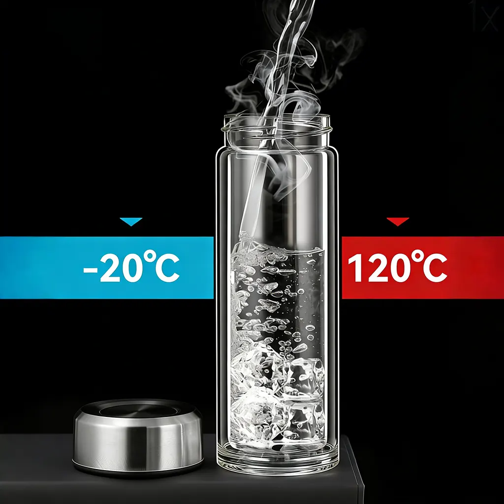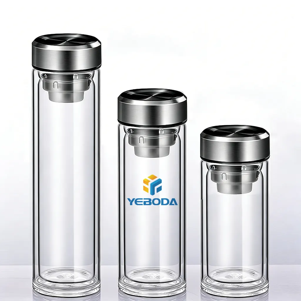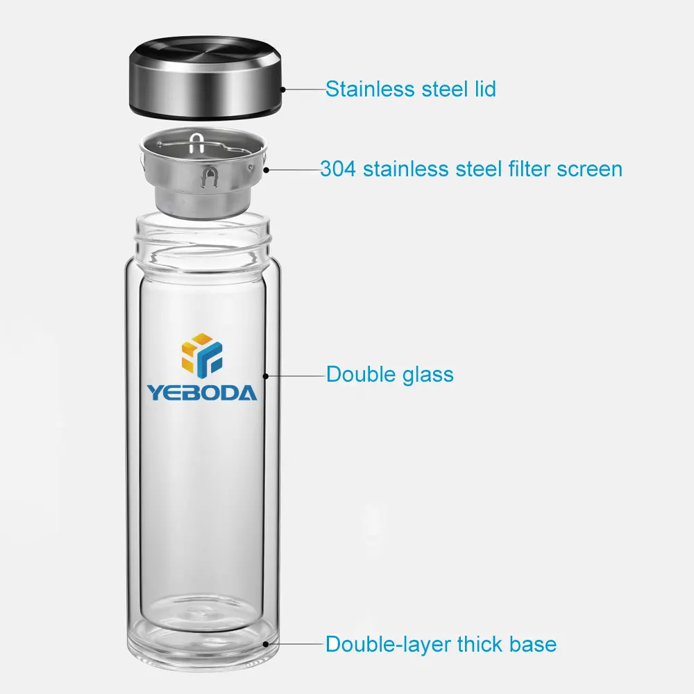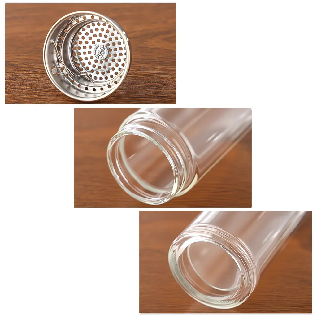 These glass drinking bottles feature a sleek cylindrical profile made from durable borosilicate glass, combined with a modern double walled water bottle structure. The glass bottle body is transparent, which emphasizes drinks and assists in heat conservation and eliminates thermal shock. The bottles have a threaded stainless steel lid, and 304 stainless steel removable filter to filter tea leaves or pulp fruit. The glass water bottle is in a wide-mouth design and therefore, it is easy to fill up and clean and the minimalistic design is suitable in offices, gyms, and when traveling. Being eco friendly water bottles, these reusable glass water bottles assist the users to remain hydrated and promote sustainable lifestyles.