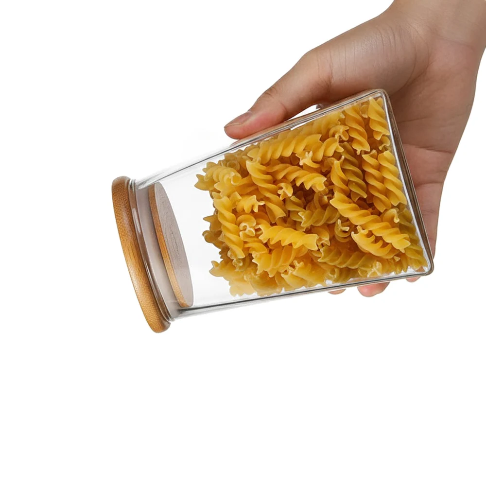 These are unusual glass jars with lids which have their own lids: they are of an unusual type of trapezoid, narrow at the top, wider at the bottom, and with sharp angles. The contents are easily visible being paired with natural bamboo lids that are light.
