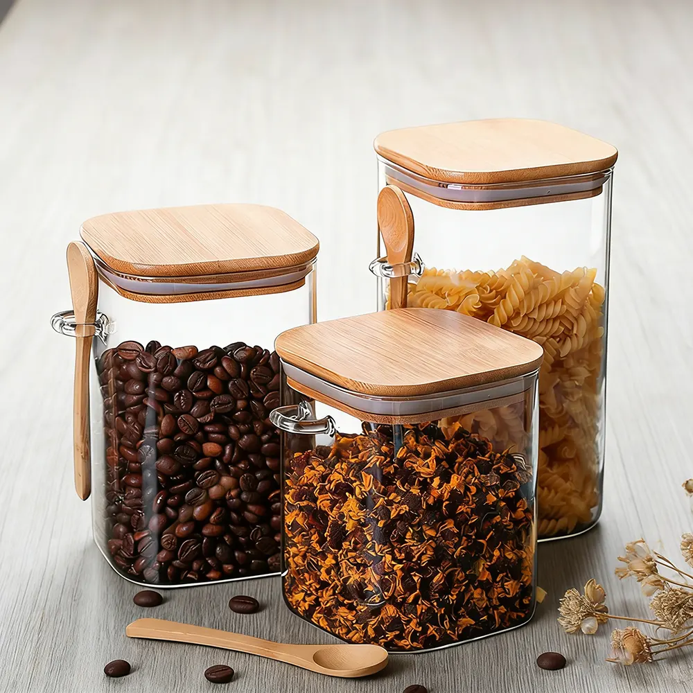 A chain of kitchenware stores needed to update their storage collection. So a European home goods wholesaler decided to go with this high-borosilicate large glass jars with lids for the kitchenware stores chain uniform display of coffee beans, tea, and dry goods. The square shape was a good fit for the shelves, and the 100mm airtight lid and the wooden spoon that came with it were great for both functionality and making the product look more luxurious.